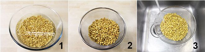 Um die Suppe aus Kichererbsenwicke zuzubereiten, beginnen Sie damit, die Kichererbsenwicke mindestens 24 Stunden lang einzuweichen 1, und wechseln Sie dabei häufig das Wasser. Nach der erforderlichen Zeit lassen Sie die Hülsenfrüchte abtropfen, spülen sie ab und stellen sie beiseite (2-3).