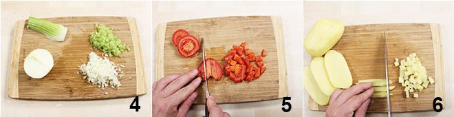 Bereiten Sie nun eine Mischung aus Zwiebel und Sellerie vor 4, dann putzen, waschen und würfeln Sie die Tomate 5 und die Kartoffeln 6.