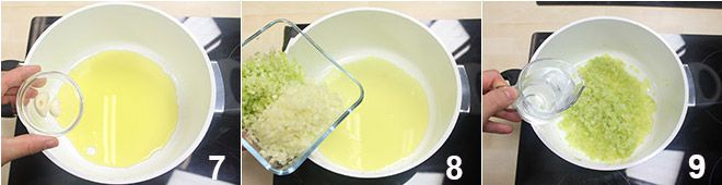In einem großen Topf zwei Knoblauchzehen bei schwacher Hitze in ein paar Esslöffeln nativem Olivenöl extra anbraten 7; wenn sie weich sind, entfernen Sie sie und fügen Sie den Sellerie und die Zwiebel hinzu 8. Lassen Sie sie ebenfalls in der Pfanne etwa zehn Minuten bei schwacher Hitze kochen; falls nötig, fügen Sie etwas Wasser bei Raumtemperatur hinzu, damit sie nicht anbrennen 9.