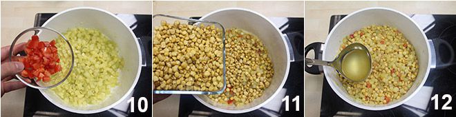 Nach der angegebenen Zeit fügen Sie die Kartoffeln, die Tomaten 10 und die Kichererbsenwicke 11 hinzu, dann mit Salz und Pfeffer abschmecken. Lassen Sie alles etwa 1 Stunde bei niedriger Hitze kochen, dabei gelegentlich Brühe hinzufügen 12 und häufig umrühren, um zu verhindern, dass die Mischung am Boden des Topfes klebt.
