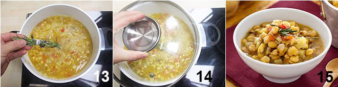 Bereiten Sie ein Gewürzbündel vor, indem Sie Rosmarin und Salbei mit einem Küchengarn zusammenbinden, und fügen Sie es dann zur Suppe hinzu 13, decken Sie es mit einem Deckel ab und lassen Sie es eine weitere Stunde bei schwacher Hitze kochen 14. Wenn die Suppe aus Kichererbsenwicke fertig ist, schalten Sie das Feuer aus und entfernen das Gewürzbündel. Servieren Sie die Suppe, solange sie noch heiß ist, und garnieren Sie sie mit einigen Rosmarinzweigen und einem Schuss nativem Olivenöl extra roh.