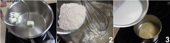 Um die Maccheroncini am Kamm mit Culatello und Parmesancreme zu zubereiten, beginnen Sie mit der Parmesancreme. Lassen Sie in einem kleinen Topf die Butter schmelzen 1 und fügen Sie dann das Mehl nach und nach hinzu 2, während Sie mit einem Schneebesen gut umrühren, um eine gut vermischte Mehlschwitze zu erhalten. Fügen Sie nun die Milch hinzu 3, die Sie in einem kleinen Topf erhitzt haben,