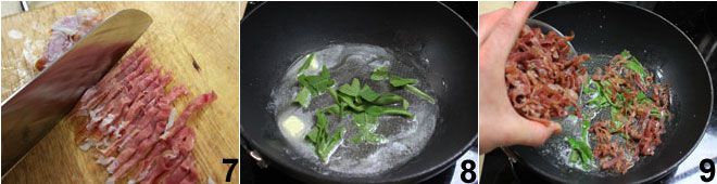 Schneiden Sie den Culatello in Streifen 7 und bereiten Sie eine Pfanne vor, in der Sie 30 g Butter mit den gut gereinigten Salbeiblättern anbraten 8. Geben Sie die Culatellostreifen in die Pfanne, lassen Sie ein paar Streifen für die endgültige Dekoration der Teller beiseite, und braten Sie sie 10 Minuten bei niedriger Hitze an 9.