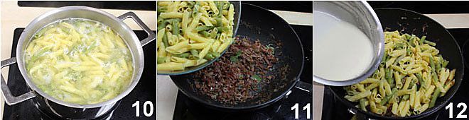 Kochen Sie die Maccheroncini am Kamm in gesalzenem kochendem Wasser für 7 Minuten 10, lassen Sie sie abtropfen und geben Sie sie in die Pfanne mit dem Culatello und dem Salbei 11. Fügen Sie schließlich die Parmesancreme hinzu 12 und mischen Sie alle Zutaten gut. Servieren Sie die Maccheroncini am Kamm mit Culatello und Parmesancreme heiß, indem Sie die Teller mit einigen Culatellostreifen dekorieren.