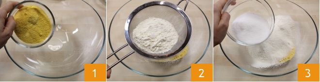 Um die Paste di Meliga herzustellen: Geben Sie feines Maismehl 1, gesiebtes 00-Mehl 2, eine Prise Salz, die Samen einer halben Vanilleschote und den Kristallzucker 3 in eine Schüssel.