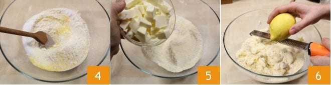 Mit einem Holzlöffel die trockenen Zutaten gut mischen 4; dann die weiche Butter in Stücken hinzufügen 5 und die Schale einer Zitrone in den Teig reiben 6. Gut mischen, um die Zutaten zu verbinden.