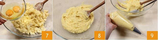 Das Ei und das Eigelb einfügen und gut in die Mischung einarbeiten 7, mit einem Holzlöffel rühren: Sie sollten einen cremigen, weichen und homogenen Teig erhalten 8. Übertragen Sie den Teig in einen Spritzbeutel mit Sterntülle 9.