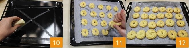 Fetten Sie die Seiten und die Mitte eines Backblechs ein 10 und legen Sie es mit Backpapier aus; drücken Sie den Teig direkt mit dem Spritzbeutel darauf und formen Sie kleine runde Donuts 11. Im statischen Ofen bei 180°C für 15/20 Minuten backen, bis die Paste gut goldgelb sind 12. Ihre Paste di Meliga sind bereit 12.