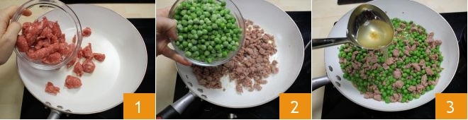 Um das Makkaroni-Timbale zu realisieren, bereiten Sie den Mürbeteig vor: Geben Sie Mehl, kalte Butter aus dem Kühlschrank, eine Prise Salz in einen Mixer und mixen Sie alles, bis Sie eine sandige, mehlige Mischung erhalten. Verteilen Sie die Mischung auf einer kalten Arbeitsfläche in einer klassischen Fontänenform und kneten Sie schnell, indem Sie nach und nach kaltes Wasser hinzufügen, bis Sie einen festen und elastischen Teig erhalten. Decken Sie alles mit Frischhaltefolie ab und lassen Sie es mindestens 40 Minuten im Kühlschrank ruhen. Bereiten Sie nun die Sauce vor: Bröseln Sie die Wurst mit den Händen und lassen Sie sie in einer Antihaftpfanne für ein paar Minuten 1 garen, bis sie Farbe angenommen hat; fügen Sie die tiefgefrorenen Erbsen hinzu 2, rühren Sie um und geben Sie eine Kelle Brühe hinzu 3. Lassen Sie alles bei mittlerer Hitze etwa 30 Minuten kochen und rühren Sie oft um, damit das Fleisch nicht am Boden der Pfanne klebt. Nach der angegebenen Zeit nehmen Sie die Pfanne vom Herd und stellen Sie alles beiseite.