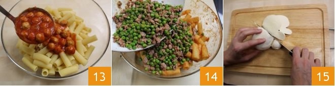 Der Pasta eine reichliche Kelle Sauce mit den Fleischbällchen 13 und den Erbsen mit der Wurst 14 beifügen. Einen Mozzarella in dünne Scheiben schneiden 15, dann den Mürbeteig aus dem Kühlschrank nehmen und mit einem Nudelholz in zwei nicht zu dünne Blätter ausrollen.