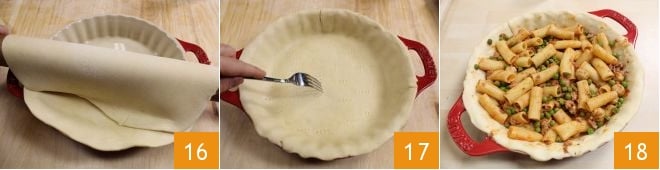 Eine runde Backform mit einem Durchmesser von 28 cm nehmen und den Boden mit einem Blatt Mürbeteig auslegen 16 und die Oberfläche mit einer Gabel einstechen 17. Beginnen Sie, das Timbale zu schichten, indem Sie die Pasta 18,