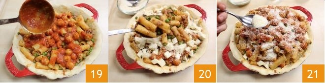 die Fleischbällchen in Sauce 19, den Mozzarella und erneut die Pasta 20 schichten: so fortfahren, bis alle Zutaten aufgebraucht sind. Schließlich reichlich Grana Padano DOP bestreuen 21;