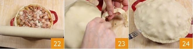 Und die Oberfläche mit dem zweiten Mürbeteigblatt bedecken 22. Überschüssigen Teig mit einem Messer entfernen 23 und die Ränder mit leichtem Druck mit einer Gabel oder den Fingerspitzen versiegeln 24.