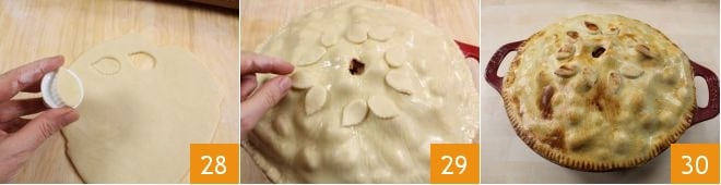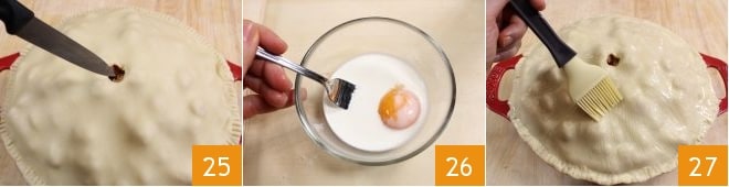 Ein Loch in die Mitte machen 25, um den Dampf während des Kochens entweichen zu lassen, damit der Teig knusprig bleibt und nicht feucht wird. Ein Eigelb mit etwas Sahne verquirlen 26 und die Oberfläche des Timbales damit bestreichen 27.