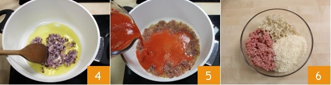 In einem separaten Topf die fein gehackte Zwiebel einige Minuten 4 bei niedriger Hitze zusammen mit 2 Esslöffeln extra nativem Olivenöl anschwitzen, dann die Tomatensauce hinzufügen 5. Lassen Sie es eine Viertelstunde weiterkochen und bereiten Sie in der Zwischenzeit die Fleischbällchen vor: In einer großen Schüssel das Schweinehackfleisch, den Grana Padano DOP und die zerbröselte Brotkrume geben 6,
