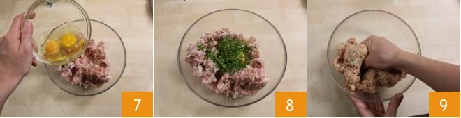 dann zwei Eier hinzugeben 7, die Petersilie 8 und mit Salz und Pfeffer abschmecken. Alle Zutaten mit den Händen vermengen, bis eine homogene Mischung entsteht 9,