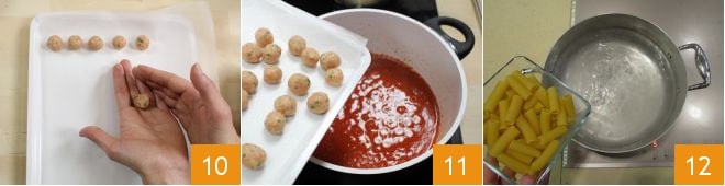dann Kugeln formen und auf ein mit Backpapier ausgelegtes Tablett legen 10. Wenn alle Fleischbällchen fertig sind, in der zuvor zubereiteten Sauce etwa eine Viertelstunde bei niedriger Hitze garen 11. In der Zwischenzeit in einem großen Topf reichlich Salzwasser zum Kochen bringen und die Rigatoni kochen, dann al dente abgießen 12.