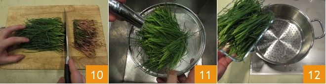Fahren Sie fort, indem Sie den Mönchsbart putzen: Entfernen Sie das rötliche Ende 10, dann waschen Sie ihn gründlich unter reichlich fließendem Wasser 11. Dämpfen Sie den Mönchsbart etwa 3 Minuten lang 12,