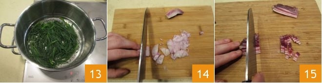 und lassen Sie ihn dabei ziemlich knackig 13. Schneiden Sie die Schalotte in Ringe 14 und dann den Räucherspeck in dünne Streifen 15.