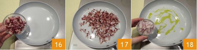 Braten Sie den Speck in einer Antihaftpfanne an 16, bis er knusprig und goldbraun ist 17. Lassen Sie die Schalotte in Ringen in einer Pfanne mit einem Schuss Öl 10 Minuten lang anschwitzen 18,