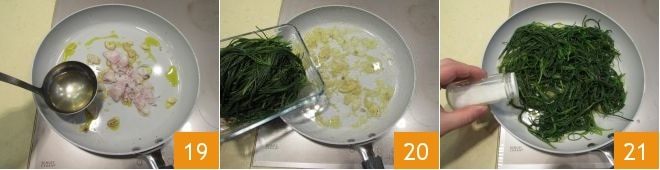 und mischen Sie gut, um Geschmack zu verleihen, indem Sie sie für ein paar Sekunden in der Pfanne schwenken 25. Richten Sie die Maltagliati mit Mönchsbart an und beenden Sie mit dem geriebenen Ricotta 26, dann servieren Sie sie heiß 27.