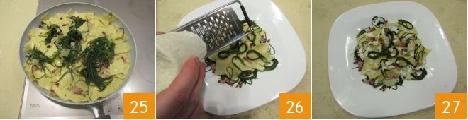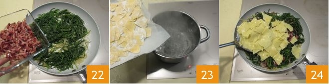und fügen Sie den knusprigen Speck hinzu, indem Sie mit einem Spatel umrühren 22. Schalten Sie die Hitze aus und halten Sie es bereit. Nach der erforderlichen Zeit bringen Sie einen Topf mit reichlich Salzwasser zum Kochen und kochen Sie die Maltagliati nach und nach für nur wenige Minuten 23, dann schöpfen Sie sie mit einem Schaumlöffel ab. Geben Sie sie direkt in das vorbereitete Dressing 24