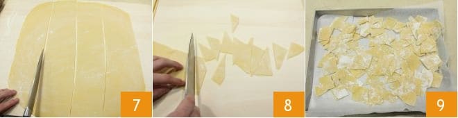Schneiden Sie dann Streifen 7 und schneiden Sie die Pasta in Rauten oder in jede beliebige Form 8. Legen Sie die Maltagliati nach und nach auf ein leicht bemehltes Tablett und bemehlen Sie sie erneut 9. Rollen Sie dann auch das andere Teigstück aus und wiederholen Sie die gleichen Schritte.