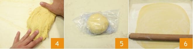 Beenden Sie das Kneten auf einer Arbeitsfläche, um eine glatte und homogene Konsistenz zu erhalten 4; formen Sie eine Kugel und wickeln Sie sie in Frischhaltefolie ein 5: Der Teig muss mindestens 30 Minuten an einem kühlen Ort ruhen, geschützt vor Luftzug. Nach der Ruhezeit nehmen Sie die Eierpasta wieder auf und teilen sie in zwei Teigstücke; während Sie das erste ausrollen, lassen Sie das andere in der Folie eingewickelt. Rollen Sie mit dem Nudelholz einen Teig von 1-2 mm Dicke aus 6.