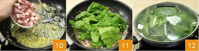 Um die Maltagliati mit Spinat und gesalzener Ricotta zuzubereiten, beginnen Sie damit, das Öl in die Pfanne zu geben, fügen Sie die gehackte Schalotte hinzu und lassen Sie sie bei schwacher Hitze anschwitzen; dann fügen Sie den Speck hinzu und lassen Sie ihn bei milder Hitze goldbraun werden 10. Geben Sie den gesäuberten Spinat hinzu 11 und decken Sie ihn mit einem Deckel ab, damit er schnell gar wird 12; wenn er gar ist, salzen Sie ihn.