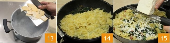 Kochen Sie die Maltagliati in reichlich gesalzenem Wasser 13 und wenn sie gekocht und bissfest sind, lassen Sie sie abtropfen und geben Sie sie mit etwas Kochwasser in die Pfanne 14: lassen Sie sie dann schwenken, pfeffern Sie und servieren Sie sie. Zum Schluss die Teller mit geriebenem gesalzenem Ricotta bestreuen 15.