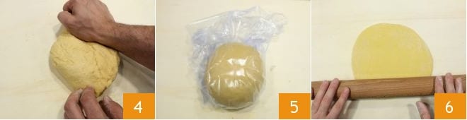 Sobald Sie einen festen Teig erhalten haben, kneten Sie ihn kräftig mit der Hand weiter, indem Sie ihn mit dem Handballen drücken 4, formen Sie ihn dann zu einer Kugel und lassen Sie ihn 30 Minuten bei Raumtemperatur in einem Plastikbeutel ruhen 5. Nach der Ruhezeit teilen Sie den Teig in 3 Teile; während Sie einen ausrollen, bewahren Sie die anderen im Beutel auf, damit sie nicht austrocknen. Rollen Sie jedes Teil mit einem Nudelholz aus 6, mehlen Sie es bei Bedarf mit Hartweizengrieß ein, um ein dünnes Rechteck zu formen; Sie sollten eine Dicke von etwa 1,5 mm erreichen, sodass beim Hochheben des Teigs der Schatten der Handfläche darunter sichtbar ist. Sie können auch mit einer Nudelmaschine ausrollen, indem Sie sie auf die schmalste Einstellung stellen und bei Bedarf mit Hartweizengrieß einmehlen. Legen Sie die Teigblätter nach und nach auf eine bemehlte Arbeitsfläche, bedecken Sie sie mit einem sauberen Baumwolltuch und fahren Sie fort, die anderen Teile auszurollen, sie übereinander zu legen, wenn sie fertig sind, getrennt durch ein trockenes Tuch.