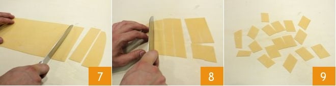 Schneiden Sie jedes Blatt in horizontale Streifen von 3 cm Breite 7. Dann schneiden Sie sie erneut in diagonale Streifen von 2 cm 8. Legen Sie die erhaltenen Maltagliati 9 auf ein leicht bemehltes trockenes Tuch und warten Sie, bis sie gekocht werden.