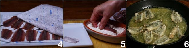 Waschen Sie die Sardellen schnell und trocknen Sie sie, indem Sie sie mit saugfähigem Papier abtupfen 4, dann wenden Sie sie in Mehl 5 und frittieren Sie sie in heißem Olivenöl 6, indem Sie sie auf beiden Seiten drehen. Legen Sie die frittierten Sardellen auf saugfähiges Papier, damit sie das überschüssige Öl verlieren.
