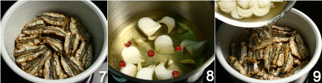 Legen Sie die Sardellen in einen Behälter 7. Geben Sie Essig, Weißwein, Salz, in Stücke geschnittene Frühlingszwiebel, in Scheiben geschnittenen Peperoni und in Hälften (oder Scheiben) geschnittenen Knoblauch in einen Topf 8. Bringen Sie es langsam zum Kochen, lassen Sie es dann 2-3 Minuten kochen und schalten Sie dann das Feuer aus. Gießen Sie die heiße Essigmischung über die Sardellen, bis sie bedeckt sind 9, und lassen Sie sie mindestens 12 Stunden an einem kühlen Ort marinieren.