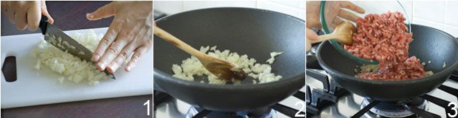 Schneiden Sie die Zwiebel fein 1. In einer großen Pfanne die Zwiebel anbraten, bis sie durchsichtig ist 2. Fügen Sie das Fleisch hinzu und braten Sie es an, bis es goldbraun ist 3.