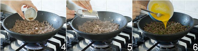 Fügen Sie den Zimt hinzu 4, etwas frisch gemahlenen Pfeffer, eine Prise Salz und den geriebenen Ingwer 5. Schlagen Sie die Eier in einer separaten Schüssel. Fügen Sie sie dem Fleisch hinzu 6 und rühren Sie gut um, bis sie gut vermischt sind und die Mischung cremig ist.