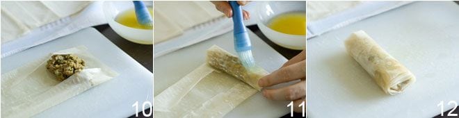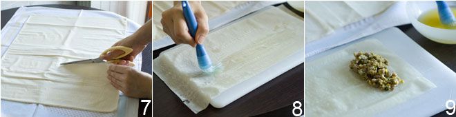 Stellen Sie das Fleisch in einer Schüssel beiseite, fügen Sie die fein gehackte Petersilie hinzu, rühren Sie um und lassen Sie es abkühlen. Den Ofen auf 150° vorheizen. Bereiten Sie die Zigarren vor: Schneiden Sie die Filoteigblätter in drei 7, sodass Sie drei ähnlich große Rechtecke erhalten. Bestreichen Sie die Oberfläche eines der Rechtecke mit geschmolzener Butter 8, legen Sie einen Esslöffel Füllung an einem Ende des Filoteigrechtecks,