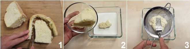 Um die mexikanischen Rouladen zuzubereiten, beginnen Sie damit, 40 g Brotkrume von einem Laib abzunehmen 1, weichen Sie es in Milch ein 2 und drücken Sie es nach ein paar Minuten mit einem Sieb und einer Gabel aus 3.