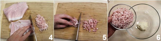 Hackstücken Sie 75 g gekochten Schinken und den Speck (4-5) und beginnen Sie mit der Füllung: Geben Sie in eine Schüssel die in Milch eingeweichte Brotkrume und fügen Sie den Schinken hinzu 6.