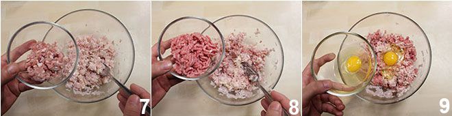 Vermengen Sie ein wenig mit einer Gabel und fügen Sie die anderen Zutaten hinzu: den gehackten Speck 7, das Schweinehackfleisch 8, die Eier 9,