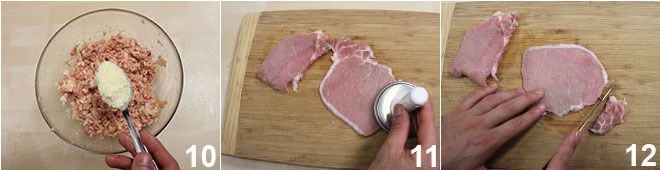 und den geriebenen Käse 10. Würzen Sie mit Salz, fügen Sie Muskatnuss hinzu und vermengen Sie alles, bis Sie eine homogene Masse erhalten. Legen Sie nun die Schweineschnitzel auf eine Arbeitsfläche, klopfen Sie sie mit einem Fleischklopfer gleichmäßig und entfernen Sie eventuell vorhandene Fettteile (11-12).
