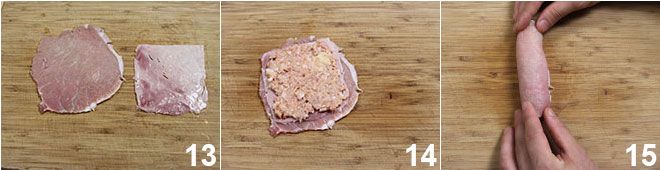 Jetzt können Sie Ihre mexikanischen Rouladen zubereiten: Legen Sie auf jedes Schweineschnitzel eine Scheibe gekochten Schinken 13, einen gut verteilten Esslöffel Füllung 14, eine weitere Scheibe gekochten Schinken und rollen Sie die Roulade auf 15.