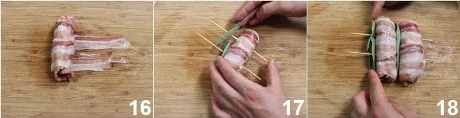 Legen Sie auf eine Arbeitsfläche 2 Scheiben Speck und rollen Sie sie zusammen mit der Roulade auf 16: Fahren Sie auf diese Weise mit den anderen 7 Schnitzeln fort und stellen Sie die Spieße zusammen, indem Sie die Roulade mit zwei Holzspießen aufspießen, abwechselnd mit zwei Salbeiblättern, und spießen Sie eine weitere Roulade mit zwei weiteren Salbeiblättern auf 18.