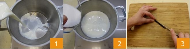 Um die Milchcreme zuzubereiten, erhitzen Sie 300 g Milch 1 zusammen mit dem Zucker in einem Topf 2. Schneiden Sie die Vanilleschote der Länge nach auf und kratzen Sie die Samen mit einem kleinen Messer heraus 3;