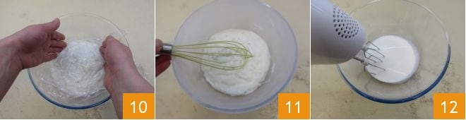 Decken Sie die Oberfläche mit Frischhaltefolie ab und drücken Sie sie gut an, um zu verhindern, dass sich eine Kruste bildet 10; lassen Sie sie bei Raumtemperatur abkühlen und stellen Sie sie dann in den Kühlschrank. Nach der erforderlichen Zeit nehmen Sie die Creme aus dem Kühlschrank 11: Sollten Sie Klümpchen feststellen, sieben Sie die Creme durch ein feines Sieb, um sie zu entfernen. Lassen Sie die Creme mit einem elektrischen Mixer aufschlagen, dann schlagen Sie in einer separaten Schüssel die kalte Sahne aus dem Kühlschrank 12.