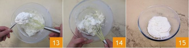 Fügen Sie die geschlagene Sahne zur mittlerweile kalten Milchcreme hinzu 13, und mischen Sie die beiden Massen sehr vorsichtig von unten nach oben 14, bis Sie eine glatte und homogene Creme erhalten 15. Ihre Milchcreme ist bereit: Sie können sie verwenden, um Windbeutel, Biskuitrollen, Torten und andere Desserts zu füllen!