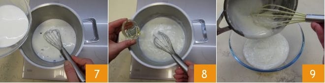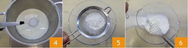 geben Sie die Samen der Vanilleschote in die Milch 4 und erhitzen Sie sie bei sehr geringer Hitze, wobei Sie gut mit dem Schneebesen umrühren, um den Zucker aufzulösen. In einer separaten Schüssel sieben Sie die Maisstärke 5 und geben dann die restliche Milch hinzu, während Sie mit einem Schneebesen umrühren 6: Auf diese Weise vermeiden Sie Klumpen in der Creme.