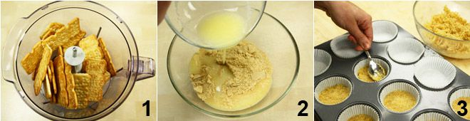 Um die Mini-Käsekuchen mit Lachs zuzubereiten, beginnen Sie mit den Böden: Zerkleinern Sie die salzigen Cracker fein in einem Mixer, bis Sie ein Pulver erhalten 1. Fügen Sie dann die geschmolzene Butter hinzu und vermischen Sie sie mit einem Löffel 2. Nehmen Sie eine Muffinform und füllen Sie sie mit Papierförmchen: Verteilen Sie die erhaltene Mischung in den Förmchen (ein gehäufter Löffel pro Förmchen) und drücken Sie die Böden mit dem Rücken eines Teelöffels flach 3. Lassen Sie alles für mindestens eine halbe Stunde im Kühlschrank abkühlen.