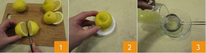 Um die Minzlimonade zuzubereiten, beginnen Sie damit, die Zitronen von ihren Blättern zu befreien, falls noch vorhanden, dann waschen, trocknen und halbieren Sie sie 1. Um den maximalen Saft zu gewinnen, pressen Sie alle Zitronenhälften mit einer Saftpresse aus 2, danach gießen Sie den Saft in ein Gefäß, in dem Sie ein feines Sieb platziert haben 3.