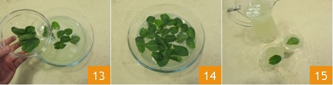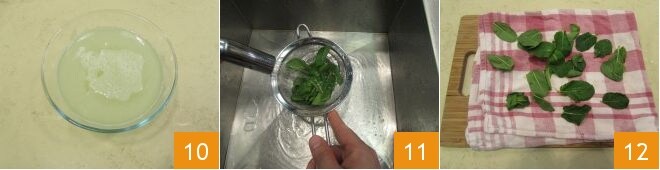 Stellen Sie das Gefäß beiseite 10 und kümmern Sie sich in der Zwischenzeit um die Minze, nachdem Sie alle Blätter von den Stängeln getrennt haben, waschen Sie sie 11 und trocknen Sie sie vorsichtig mit einem sauberen Küchentuch 12